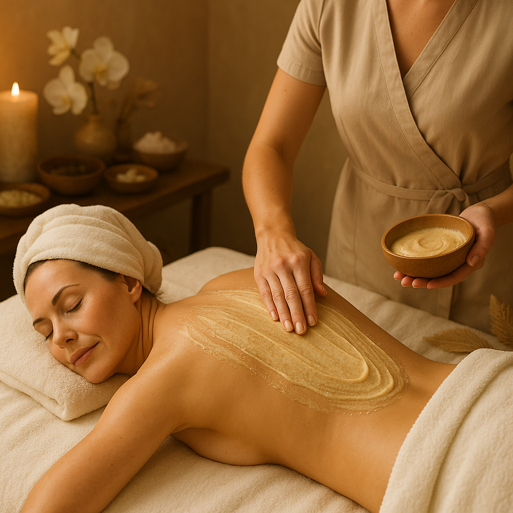 El ritual comença amb una exfoliació suau amb sals minerals i extractes naturals que eliminen les cèl·lules mortes i estimulen la regeneració cutània. A continuació, s'aplica un embolcall nutritiu amb llet, mel i olis essencials , que aporten suavitat, elasticitat i una lluentor natural a la pell. El tractament finalitza amb un massatge relaxant i hidratant , que calma els sentits i deixa la pell radiant i renovada.